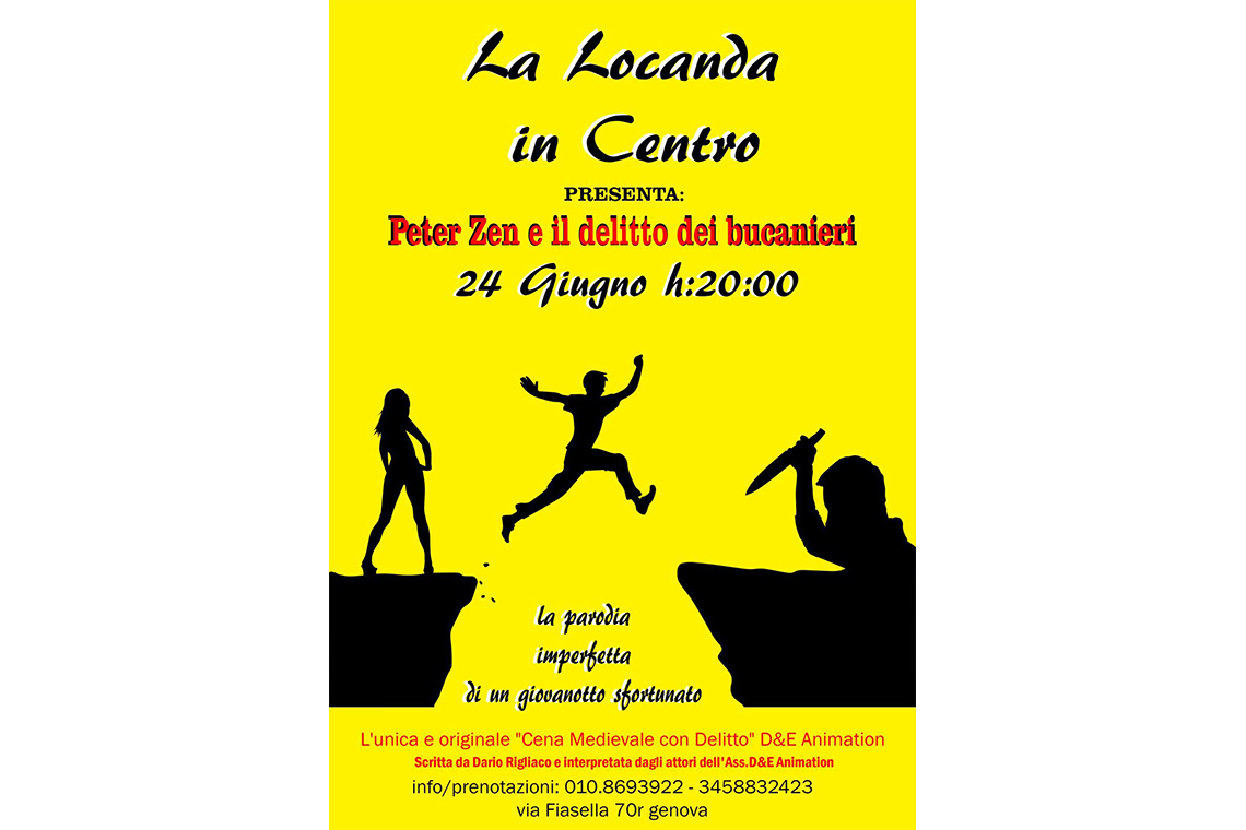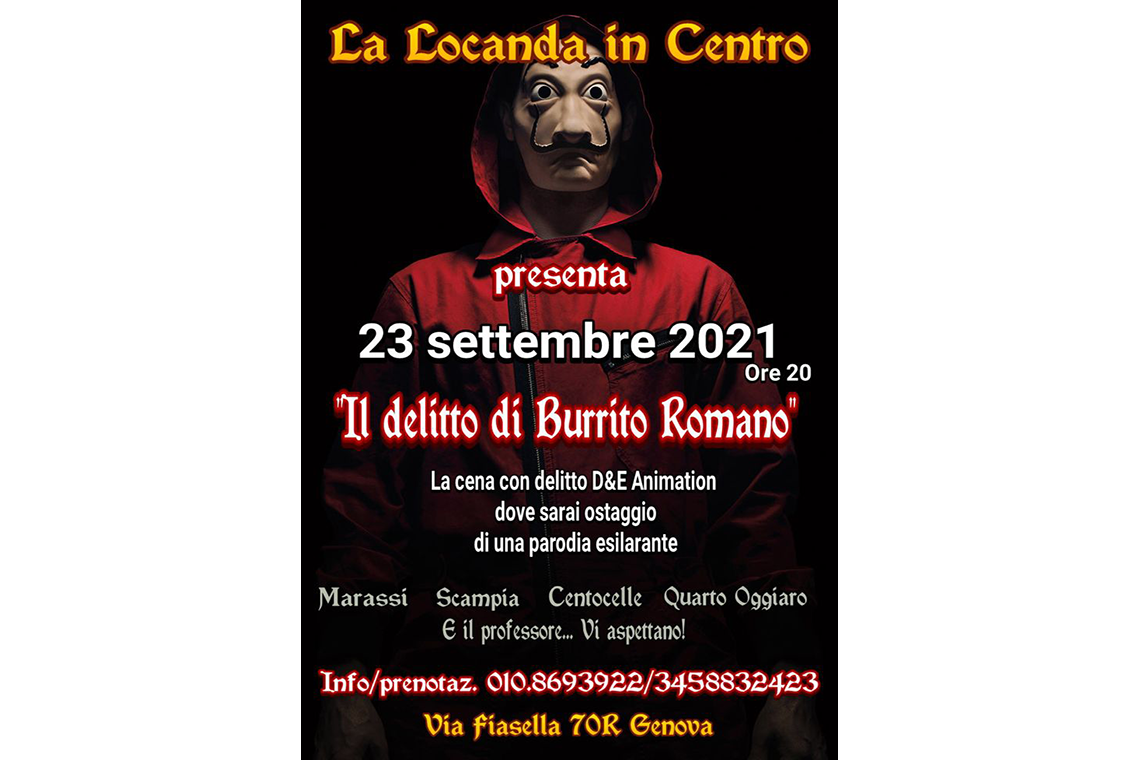Genova -I commensali? In questo caso l’autore preferisce chiamarli “ostaggi” all’interno di un ristorante, dove tra una portata e l’altra si svolgerà uno spettacolo interattivo in quattro atti, dove verranno svelati gli indizi per risolvere un delitto che rischia di mettere a repentaglio il piano del professore. “Il delitto di Burrito Romano”, è questo il titolo della cena; è stato ucciso appunto uno degli ostaggi e questa notizia non deve trapelare all’esterno altrimenti verrà data la colpa ai criminali che perderanno consensi mentre il piano va in frantumi. La soluzione? Semplice, trovare l’assassino e consegnarlo alla polizia, mantenendo i nervi saldi e seguendo le istruzioni per una rapina “imperfetta”. I commensali sono muniti di “scheda personaggio” e di maschera di Dalì, per poter giocare in modo interattivo nel mentre si gustano la cena. Il detective migliore alla fine sarà premiato dal ristorante con un premio a sorpresa.